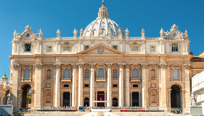 Portico: Basilikaens søjlegang er større end de fleste kirker i verden og huser Den hellige dør, Giottos Navicella og Johannes XXIII's våbenskjold.
